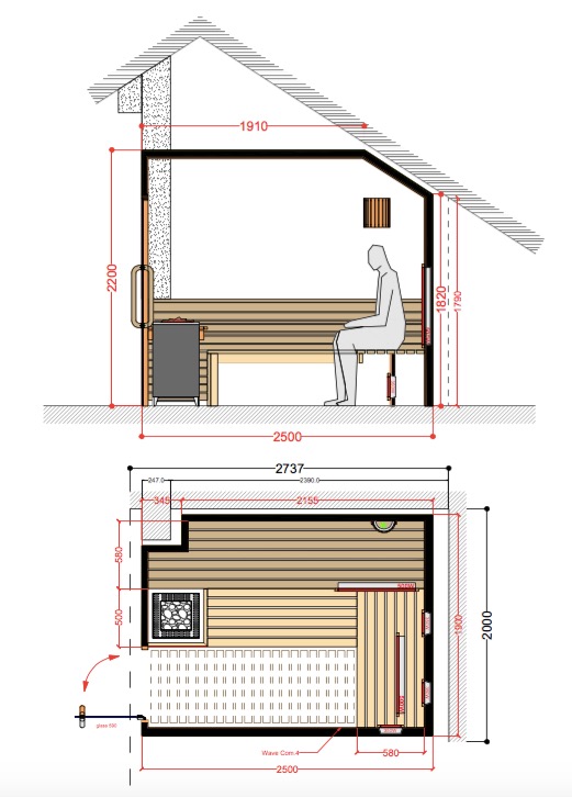 特色: 善用屋頂的小空間,在斜屋頂安裝客製化二合一(紅外線+芬蘭浴)烤箱