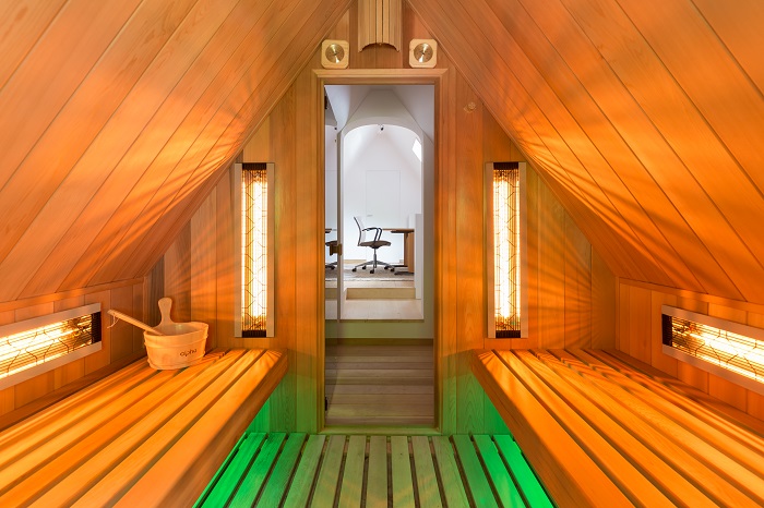 沒有不夠用的空間,只有不被善用空間。屋頂的空間,大多數的家庭都沒有好好利用,頂多是拿來當儲藏的空間。但是只要善加規畫設計,其實即便是斜屋頂的小空間,也可以設計成桑拿房,打造一個放鬆紓壓的美妙空間。